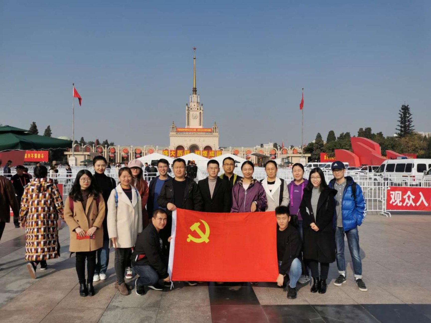在参观活动结束后,同学们聚集在北京展览馆广场“庆祝中华人民共和国成立70周年大型成就展”巨幅展板前同党旗合影留念,同学们也纷纷分享了自己的感受和对祖国的祝愿。