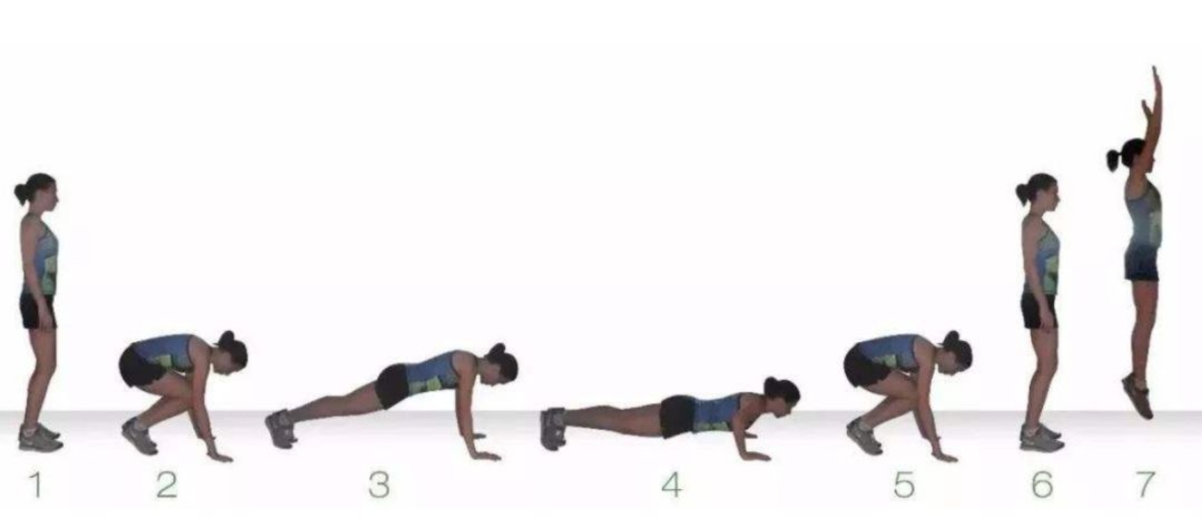 1.双脚与肩同宽站立,俯身下蹲,双手撑地与肩同宽,同时双腿向后跳跃伸直;