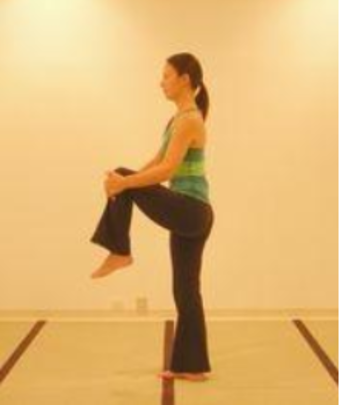 2.左膝抬至胸前,双手抱膝向上提拉,左脚尖勾起,同时右脚后脚跟踮起,收紧右臀,保持背部挺直,拉伸动作保持1-2秒;