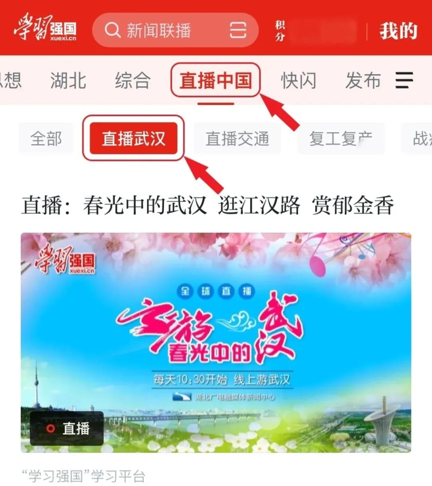 推荐频道点击“强国直播”,或进入“直播中国”频道“直播武汉”,就能实时收看。