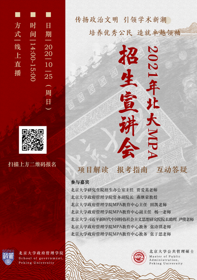 开云电竞平台官网首页MPA教育中心将于2020年10月25日(星期日) 14:00-15:00举行2021年公共管理硕士(MPA)招生宣讲会,欢迎有兴趣的考生扫码报名参加。