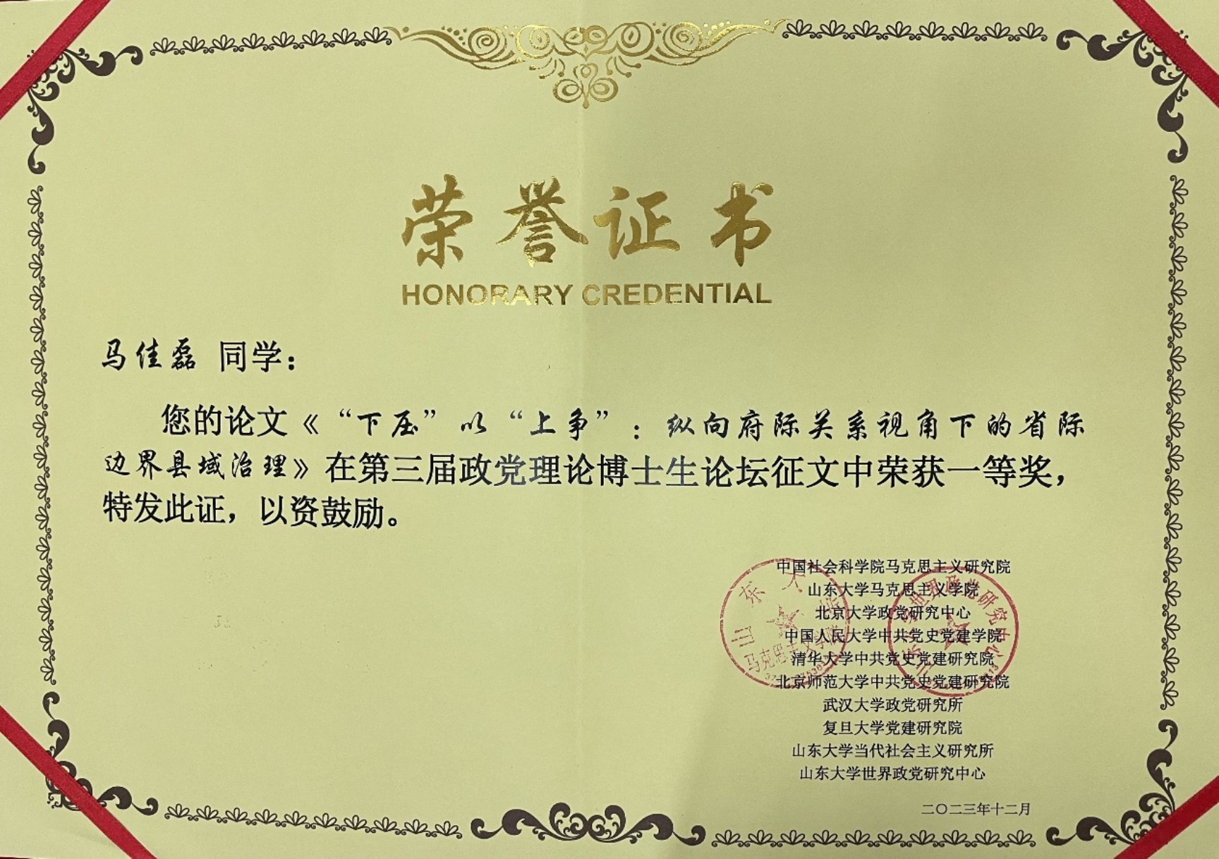 我院马佳磊同学在大会上做了题为《“下压”以“上争”:纵向府际关系视角下的省际边界县域治理》的论文宣讲,该文荣获第三届政党理论博士生论坛征文一等奖。
