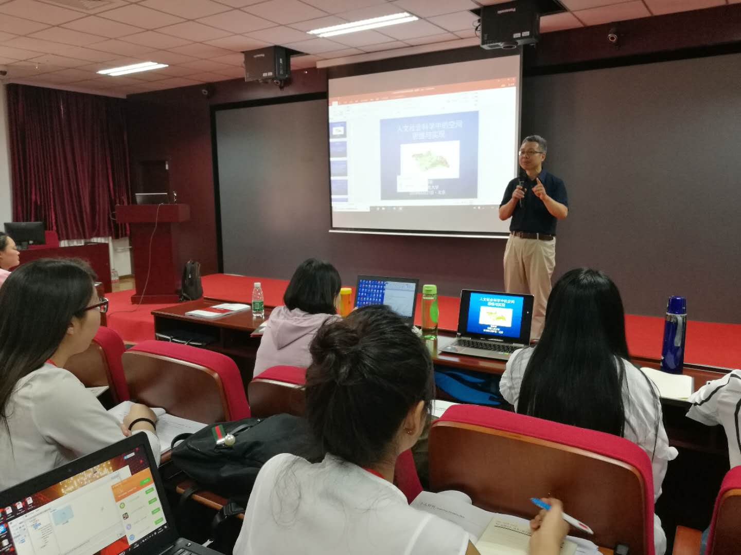 当天下午,2018北京大学空间计量经济学暑期学校课程在地质大学信息工程学院开课。第一位主讲人是来自中国人民大学人口所的杨耀军教授,他的授课题目:人文社会科学的空间思维与实现。
