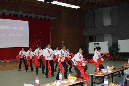在2012级本科生米拉等少数民族同学共同表演的独具异国风情的印度舞之后,晚会拉开了序幕。学院教工舞蹈团为现场师生表演了精心编排、欢乐热烈的腰鼓舞蹈《欢聚一堂》,看到平常在办公室里为同学们服务的老师们在舞台上一板一眼的认真表演,同学们给予了长时间热烈的掌声。