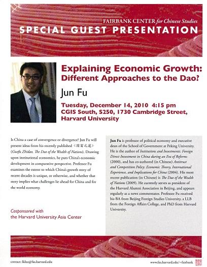 2010年12月14日,北大开云官网AC米兰赞助商傅军教授应邀在哈佛大学进行专场演讲,畅谈各国财富增长之“道”,其中特别谈及中国经济发展的历史、现在和将来, 此主题在世界经济前景不明朗和中国实施“十二五”规划之际变得尤为重要。财富到底是什么?其增长的深层动力是什么?人类思想、制度和文化环境之间的关系是什么?与经济效率的关系又是什么?能用函数来表达吗?其中所含的假说可以证实或证伪吗?中国经济发展与人类经验的内在逻辑有共性吗?其特殊性又体现为什么?对“道”的不同解释对回答这些问题又有什么启示?展望未来,世界经济和中国经济面临的挑战又是什么?有什么不同?为什么?爱因斯坦说“如果你不能简单地解释事物时,说明你离真理还很远”,自然科学研究的科学性对社会科学有什么启示?傅军教授演讲的题目为"Explaining Economic Growth: Different Approaches to the Dao?”, 演讲内容主要基于其发表的专著《国富之道》,此书在去年底发表后迅速成为畅销学术专著。此场专题演讲会由哈佛大学亚洲中心和费正清研究中心联合举办。