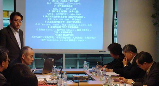 政府学院院务会成员 ― 傅军、李成言、徐湘林、李国平、白智立、朱天飚、李靖、李海燕参加了调研会。会议在学院图书馆举行。常务副院长傅军教授从学院的定位、软硬件配置、学科组成和方向、教员和生源预测、国际化发展前景等方面向校领导作了主干汇报。其他成员则分别就各自负责的工作进行了补充报告。