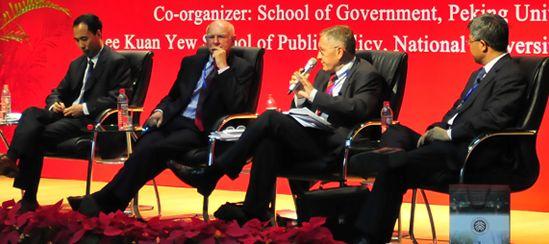 从左至右:新加坡前驻联合国大使、李光耀公共政策学院院长Kishore Mahbubani,北大国际关系学院院长王缉思,美国前助理国务卿、普林斯顿大学教授Thomas Christensen、日本前副外长、日本国际交流中心资深研究员Hitoshi Tanaka在“全球治理的前景”论坛上