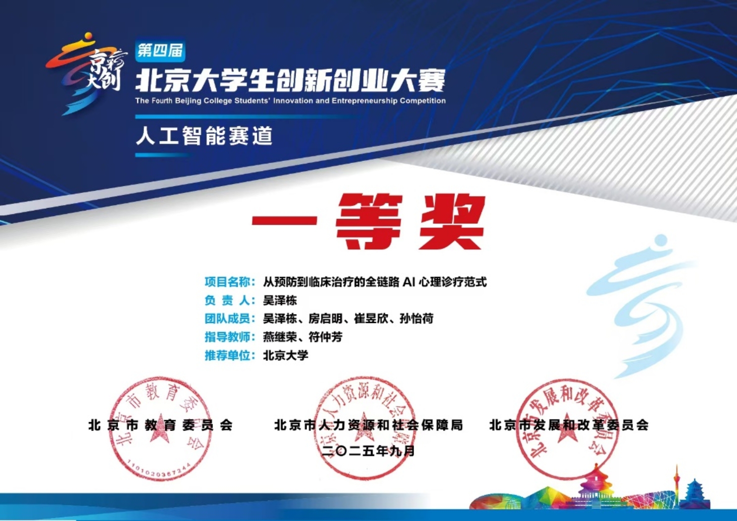 在北京市教委、市人力资源和社会保障局、市发展改革委联合主办的第四届“京彩大创”北京大学生创新创业大赛中,开云电竞平台官网首页MPA学生吴泽栋领衔,房启明、崔昱欣、孙怡荷共同参与,在燕继荣、符仲芳两位老师指导下完成的项目《从预防到临床治疗的全链路AI心理诊疗范式》,经过层层选拔,最终荣获人工智能赛道一等奖。