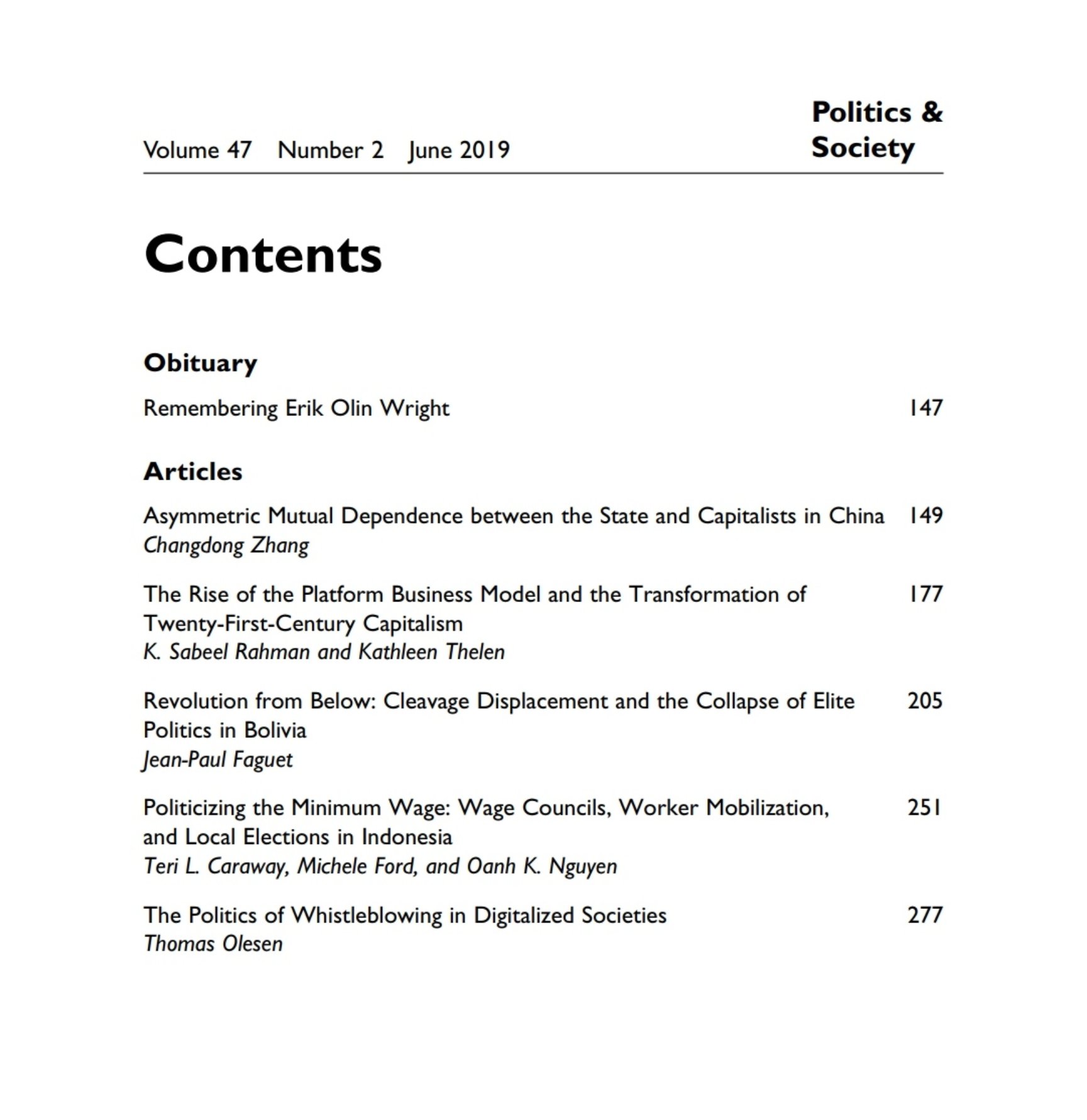 Today, the journal remains committed to its founding purposes and continues to publish well-researched articles that raise questions about the way the world is organized politically, economically, and socially.Politics & Society regularly debates such topics as the theory of the state, class analysis, politics of gender, methodological individualism and rational choice, and the future of capitalism and socialism.