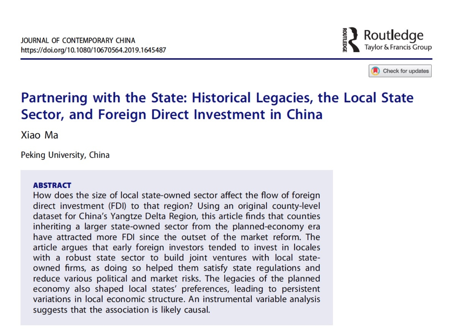 【最新发表】马啸助理教授教授在《Journal of Contemporary China》发表论文:“与国家成为伙伴:历史遗产,地方国有资本与外商直接投资”
