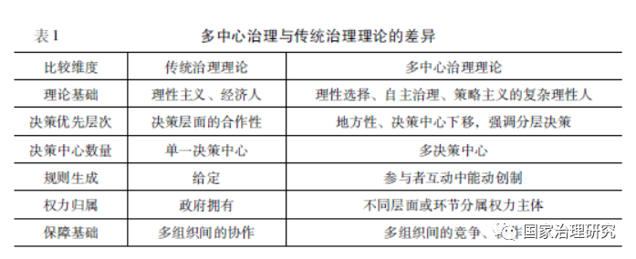 (一)多中心治理理论 “多中心”一词最早出现在英国学者波兰尼(Michael Polanyi)《自由的逻辑》(1951年)一书中,用以阐述自发秩序(spontaneous order)的生成及社会自我管理可能性问题。埃莉诺·奥斯特罗姆(Elinor Ostrom)采取多学科的研究方法,以五千多个公共池塘资源治理案例为对象,发现且有力地证明了在市场机制和国家机制之外存在自主组织、自主治理的解决方案。 多中心治理理论认为,集权和分权两种传统单中心治理理论都有无法克服的缺陷,据此坚决反对权力的集中与垄断,主张因地制宜,在多样性制度安排下,政府、市场、社区等多行为主体在追求利益的同时,也能相互协调并达成合作,促进公共事务的持续发展。多中心治理理论,将政府手段所具有的公共性、集中性和市场的强回应性、高效率性的优点综合起来,建立起一种新的、具有竞争性或准竞争性的公共物品供给之道。 与其他治理理论相比,多中心治理有着明显不同的理论观点(见表1):