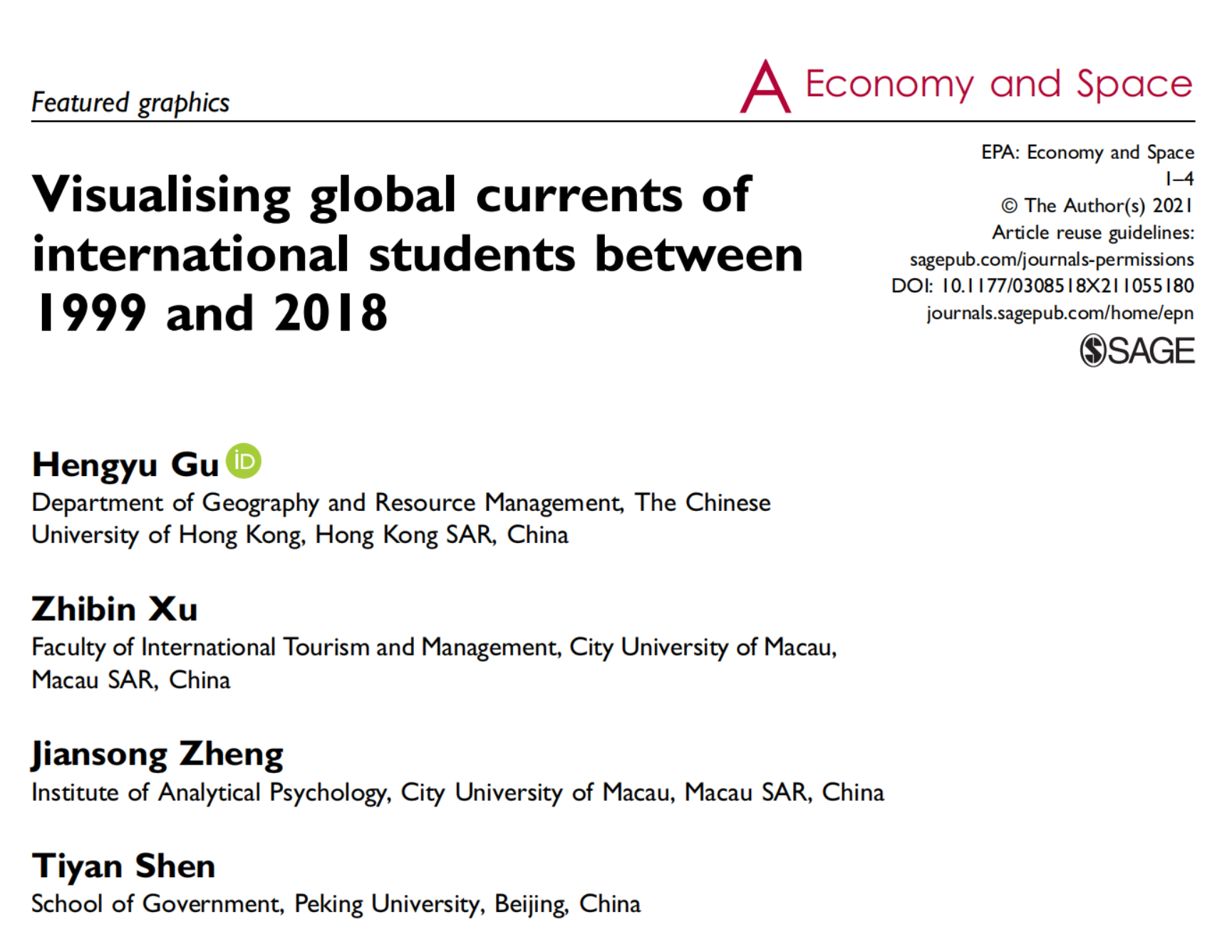 我院沈体雁教授团队论文Visualising global currents of international students between 1999 and 2018(1999年至2018年全球留学生洋流可视化)在国际区域和地理环境研究SSCI杂志Environment and Planning A-Economy and Space的Featured graphics栏目发表(2020年影响因子为4.056)。