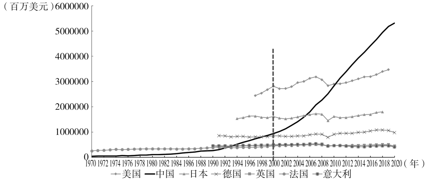 图:1970—2020年世界主要经济体GDP总量变化(2010年不变价)