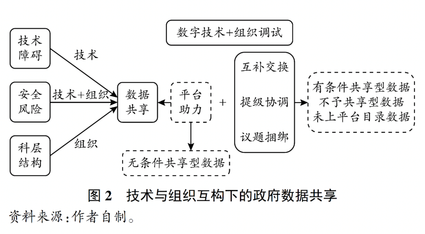 总体来看,平台并不能自动推进数据共享流程,需要组织发挥自主性和能动性调整结构要素,形成适配数据共享的三种机制,并依托平台提供的技术工具最终完成数据共享。可见,数据共享应放到数字技术与科层组织互动的理论框架下理解和把握,数字技术与组织调试叠加推动了数据共享进程,如图2所示。