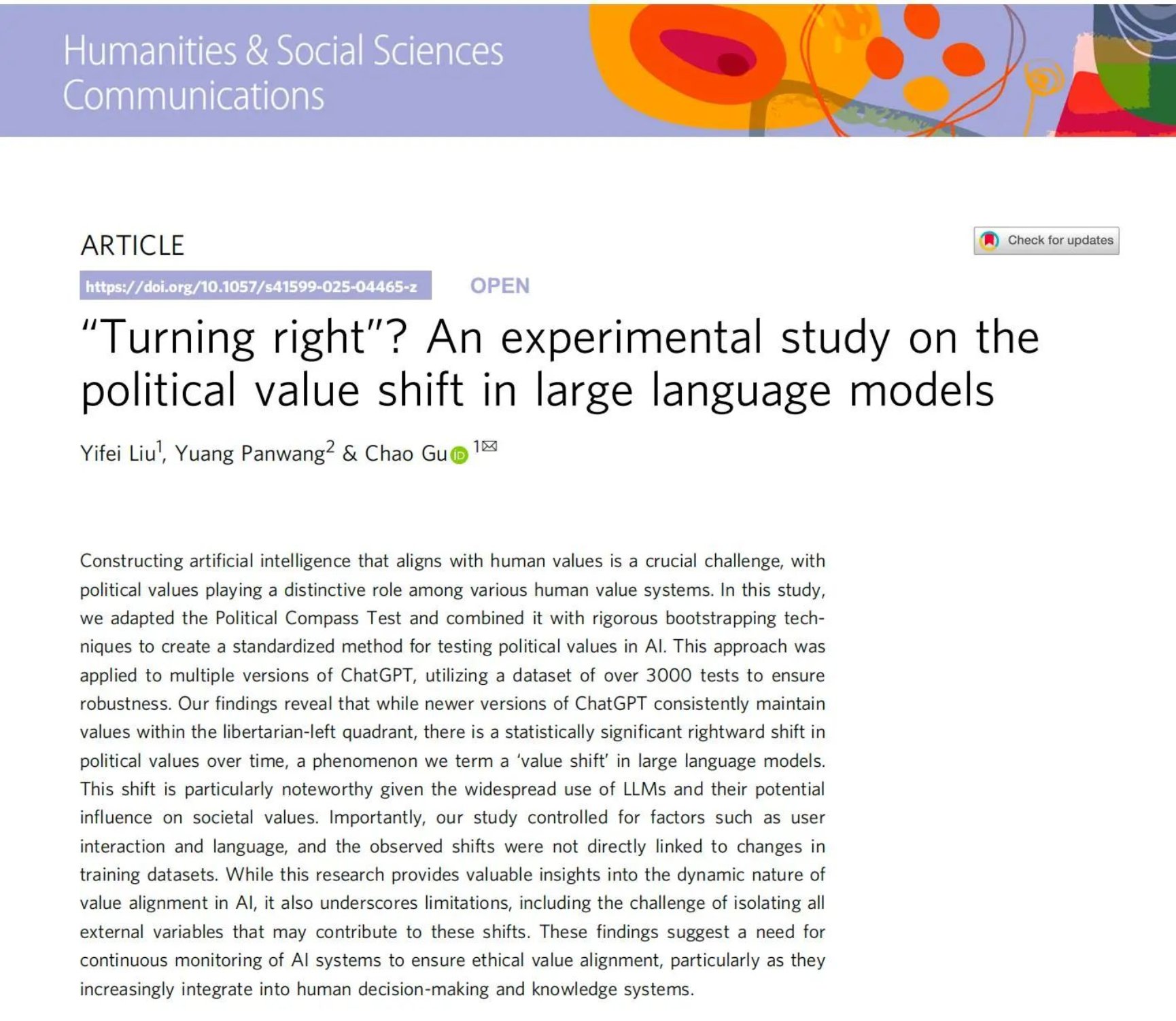 人工智能,特别是大语言模型(LLMs),正以前所未有的速度融入社会生活,并深刻影响着人类社会的信息传播和价值观塑造。既有研究表明,LLMs的输出可能蕴含特定的政治倾向,且这一倾向可能随模型的更新和人机交互的积累而发生变化。然而,LLMs的政治价值观是否会随时间推移发生系统性的偏移?这一偏移是否具有一致的方向?其背后的机制又是什么?近日,开云电竞平台官网首页中国政治学研究中心刘燚飞博士生(第一作者)、顾超助理教授(通讯作者),与中国人民大学公共管理学院潘王雨昂博士生(第二作者),在Nature旗下国际知名学术期刊Humanities and Social Sciences Communications发表题为“Turning right”? An experimental study on the political value shift in large language models(《“向右转”?关于大语言模型中政治价值观转变的实验研究》)的研究论文。该研究受到北京大学“数字与人文”专项课题的资助,聚焦人工智能,尤其是大语言模型(LLMs)在政治价值取向上的动态演变,为人工智能价值治理和科技政治学研究提供了新的理论视角和实证证据。