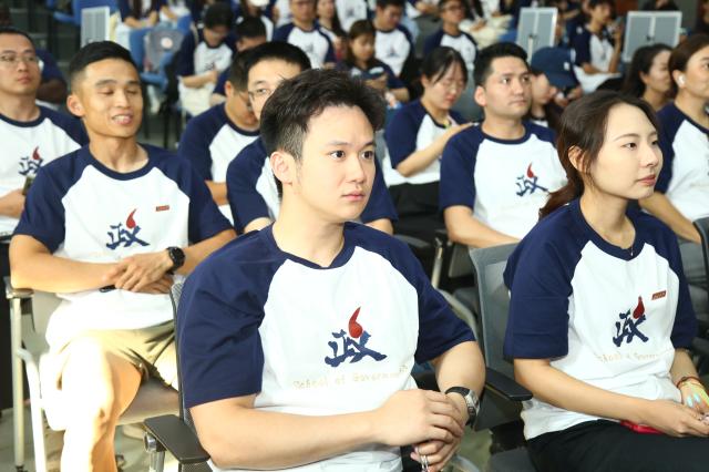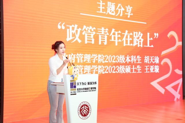 本次开学典礼特别设置了“政管青年在路上”主题分享环节,2023级本科生胡天瑜、2023级硕士生王亚璇分享了暑期实习、思政实践的经历和感悟。胡天瑜深入百千万工程参与调研,深感与广大基层人民朴素的想法同鸣共振是社会调查和基层工作的要旨,并借此抒发了“走进广袤田野,走进人民心中”的倡议。王亚璇结合政府基层工作和亲历农业科学管理的经验,体悟田野调查的温度与厚重,鼓励同学们一致秉持“天下为公、报国为怀”的信念,勤奋读书,稳健行路。